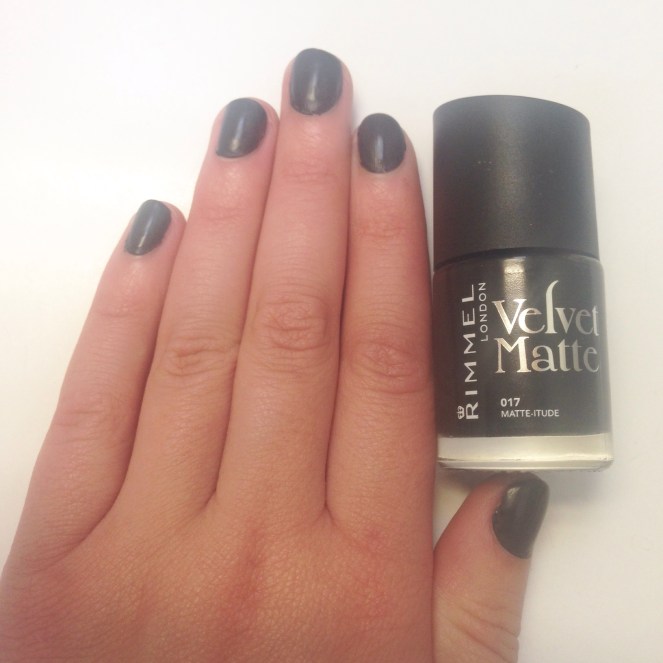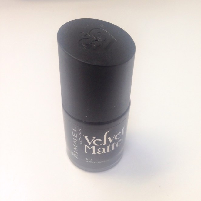 I was lucky enough to get my hands on one of the new shades from Rimmel Londons new range. Velvet matte in shade 017 matte-itude. It looks to be a classic matte black. I love the packaging on this nail polish, especially how the lid is on an angle. Very stylish!